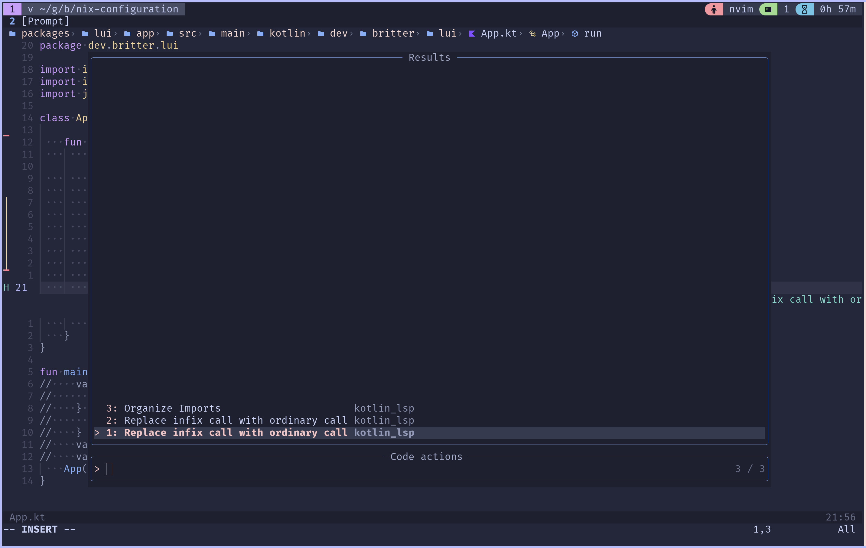 While the tooling landscape for Kotlin seems to be scattered outside of Intellij IDEA, an official language server by the Kotlin team has been release. Setting it up on traditional configuration systems requries installing the language server release and than wiring things up correctly with nvim-lspconfig while making sure no clashes with the JAVA_HOME environment variable occure. In this blog post I’ve shown how to use Nix for automatically downloading and installing kotlin-lsp and configuring it in Neovim using the NixVim configuration framework. The result is a reproducible development environment, that can be rolled out on any system that has a Nix installation without manual steps.